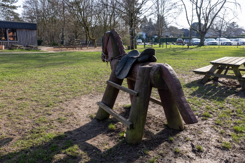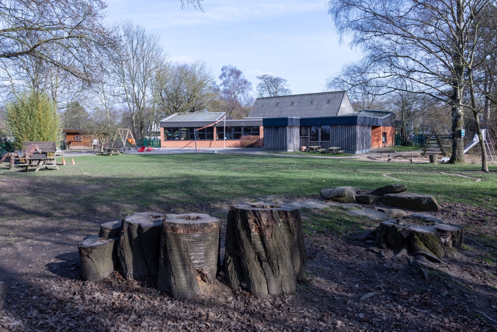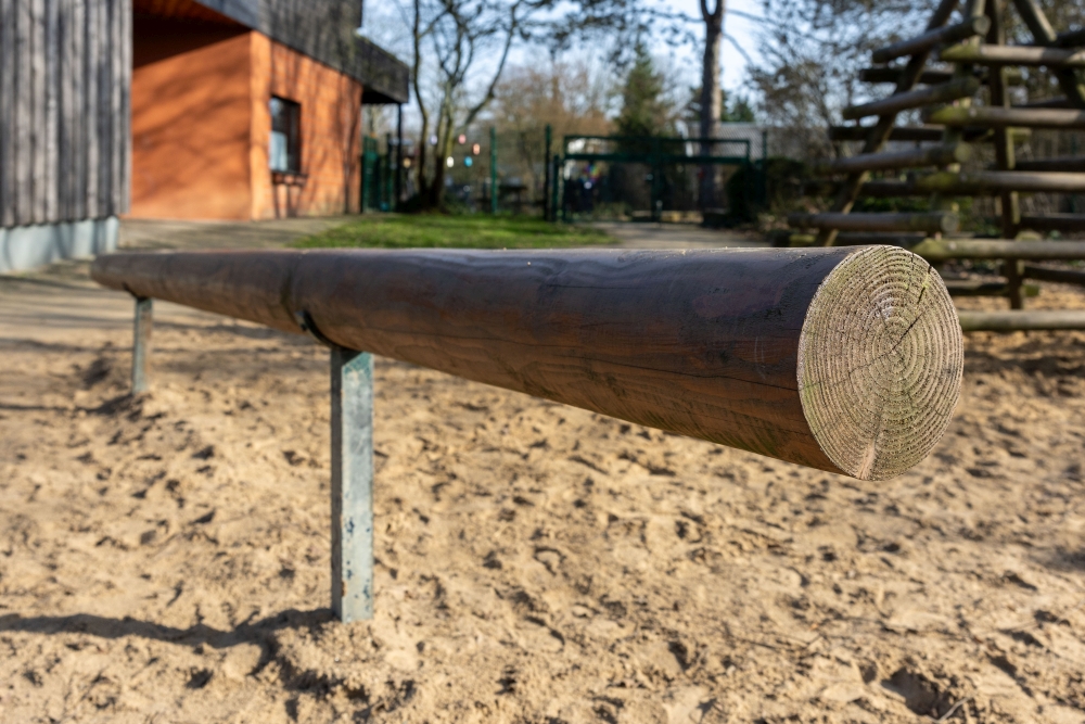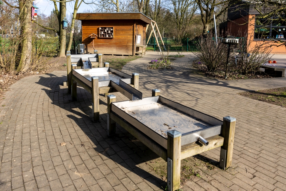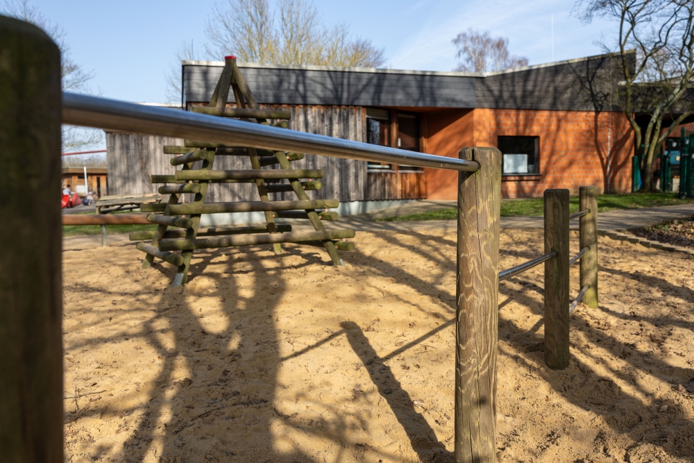 Zum Kinderhaus gehört ein weitläufiges Außengelände mit Spielgeräten, Sandkasten, Erlebnispfad, Garten, Wasserspielplatz, einem Klettergerüst und einem Bewegungsparcours.